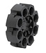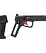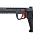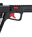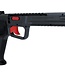 This pellet pistol uses an 8-shot rotary magazine with a quick-change magazine system that makes it simple to detach the magazine by pressing the red button on either side of the frame, and it includes three total magazines in the package. It is powered by a single 12-gram CO2 cartridge housed in the grip frame, and the grip slides back to make changing the cartridge easier.